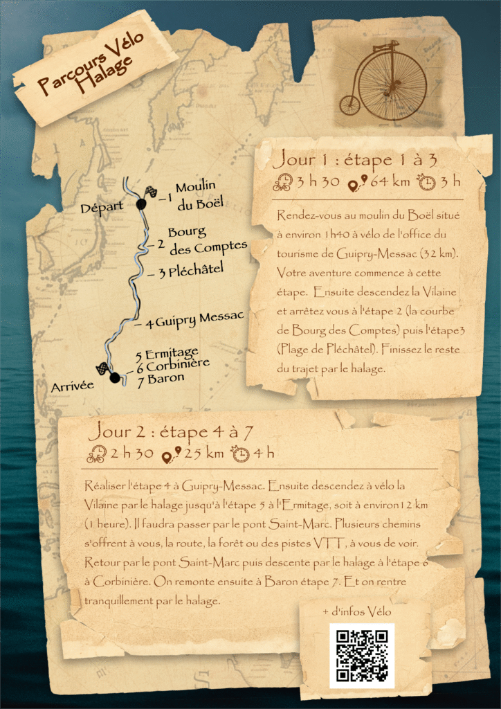 Si vous êtes en vélo, la quête sera possible en deux jours. Une pause au milieu à Guipry-Messac, au camping par exemple, est possible. Vous roulerez sur le chemin du halage, tout le long de la Vilaine.
